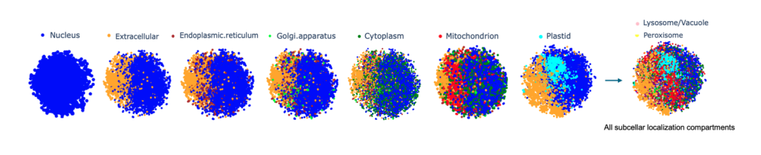 The researchers represented each protein sequence as a high-dimensional vector of size 32×2048, embedded the Prot42-L model in the entire protein sequence and performed calculations. In order to intuitively evaluate the differentiation of quality in embedding and compartments, the researchers applied t-distributed stochastic neighbor embedding (t-SNE) to reduce the dimensionality, making the visualization of protein groups clear.It has been verified that Prot42 performs well in the task of protein subcellular localization prediction, and its accuracy is comparable to that of existing advanced models.Through visual analysis, the research team further verified the effectiveness of the Prot42 model in capturing the subcellular localization characteristics of proteins.