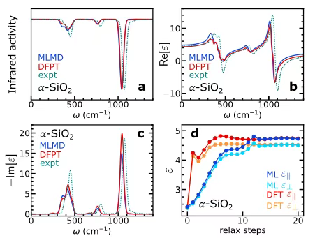 In the study of vibration and dielectric properties,The researchers chose α−SiO₂ as a typical research object, extracted 200 frames of data of 72 atoms from the molecular dynamics simulation of classical potential energy, and trained the corresponding machine learning model based on this. In order to further explore the accuracy of the model, a supercell containing 24,696 atoms was constructed. After 10 picoseconds of equilibrium under the NVE ensemble, a 200 picoseconds machine learning molecular dynamics (MLMD) simulation without electric field was carried out. The infrared spectrum was calculated by polarization dynamics, and the polarization and polarizability dynamics were analyzed to determine the frequency-dependent dielectric constant. Finally, the results were compared with the calculation results based on density functional perturbation theory (DFPT) and experimental data.