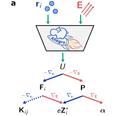 In the process of building the model architecture,Researchers rely on the Allegro platform.Taking full advantage of the high precision and outstanding data efficiency of equivariant neural networks,At the same time, by strictly following the local design concept, the model has achieved excellent scalability. In terms of the model input design, as shown in the figure, the researchers cleverly merged the electric field E with the atomic position r_i, which enables the model to simultaneously carry out the learning tasks of electric enthalpy U, force F_i, polarization P, Born charge Z_i and polarizability α.