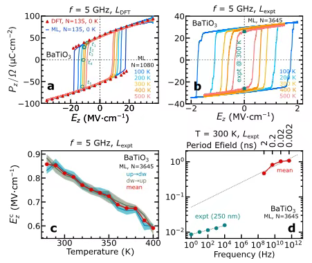 To further evaluate the effect of temperature on the ferroelectric response, the researchers conducted MLMD in the NVT ensemble under a 5 GHz sinusoidal electric field. The study found that, as shown in Figures bc above,As the temperature increases, the intrinsic coercive field decreases, while the spontaneous polarization is relatively less affected by temperature.Whether at zero temperature or finite temperature, the hysteresis curves show electric field sign symmetry, which is consistent with the characteristics of polarization conservative vector fields. In addition, when using a 3,645-atom supercell with experimental lattice parameters for research, the spontaneous polarization is consistent with the experimental results, and the coercive field is also closer to the experimental value, while verifying the model's ability to extrapolate under supercells with different atomic numbers and lattice parameters.