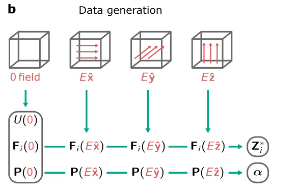In the process of generating training data,As shown in the figure below, the researchers used DFT calculations to obtain data in the area around zero electric field, and used the finite difference approximation method to determine the values of Born charge and polarizability. After training, the model has the ability to output enthalpy, and then derive a series of key parameters such as force, polarization, Born charge and polarizability by calculating the first and second order derivatives of the output enthalpy.