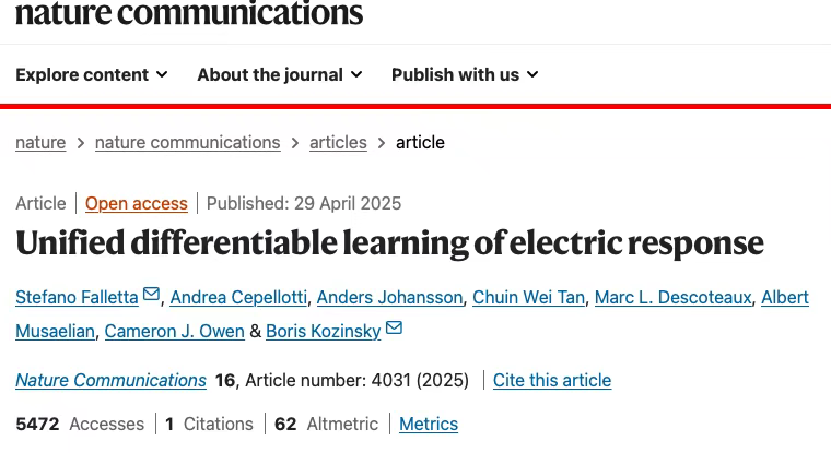 The relevant research results have been published in the internationally renowned journal Nature Communications under the title "Unified differentiable learning of electric response".