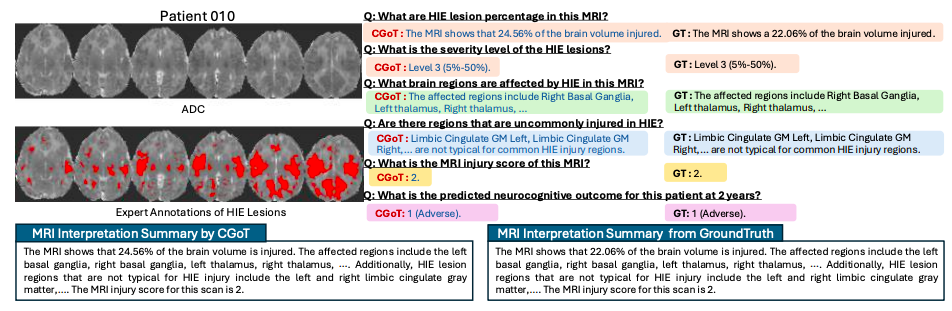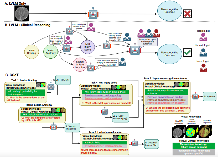 In order to overcome this dilemma, an interdisciplinary team from Boston Children's Hospital, Harvard Medical School, New York University, and MIT-IBM Watson Laboratory collected ten years of MRI images and expert interpretations of 133 individuals with hypoxic-ischemic encephalopathy (HIE).Constructed a professional-level medical reasoning benchmark dataset,Aims to accurately evaluate the reasoning performance of LVLMs in medical professional fields.The research team also proposed a clinical mind map model (CGoT).The ability to simulate the diagnostic process through clinical knowledge-guided mind-mapping prompts allows the incorporation of domain-specific clinical knowledge as visual and textual inputs, significantly enhancing the predictive power of LVLMs.