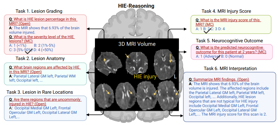 Although the sample size was only 133 cases, through a 17-year (2001-2018) multicenter retrospective collection, combined with the low incidence of HIE in tertiary hospitals of 1-5‰,This dataset has become the first HIE-specific benchmark that integrates imaging, clinical, and prognostic multimodal information.Its labeling accuracy and clinical depth are sufficient to make up for the scale limitations, providing an indispensable benchmark for LVLMs to break through the bottleneck of "basic identification" and enter the deep waters of diagnosis and treatment decision-making.