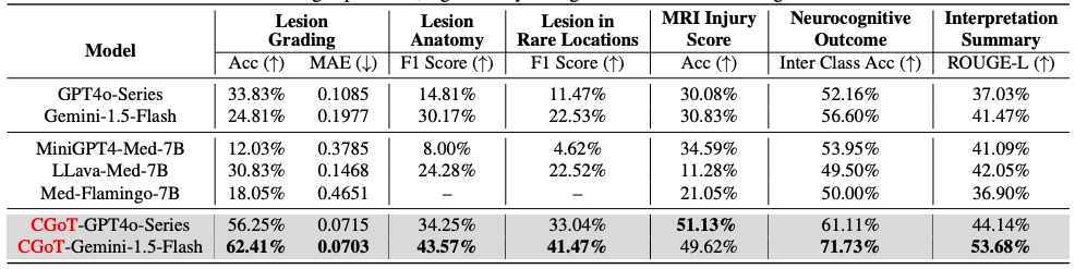 In sharp contrast, as shown in the following table,The CGoT model achieves breakthrough improvements in key tasks by integrating clinical mind maps and cross-modal knowledge——Especially in the core clinical need of two-year prognosis prediction, its performance is improved by more than 15% compared with the baseline model, and the accuracy and consistency of tasks such as lesion grading and injury scoring are also significantly better than the control group.