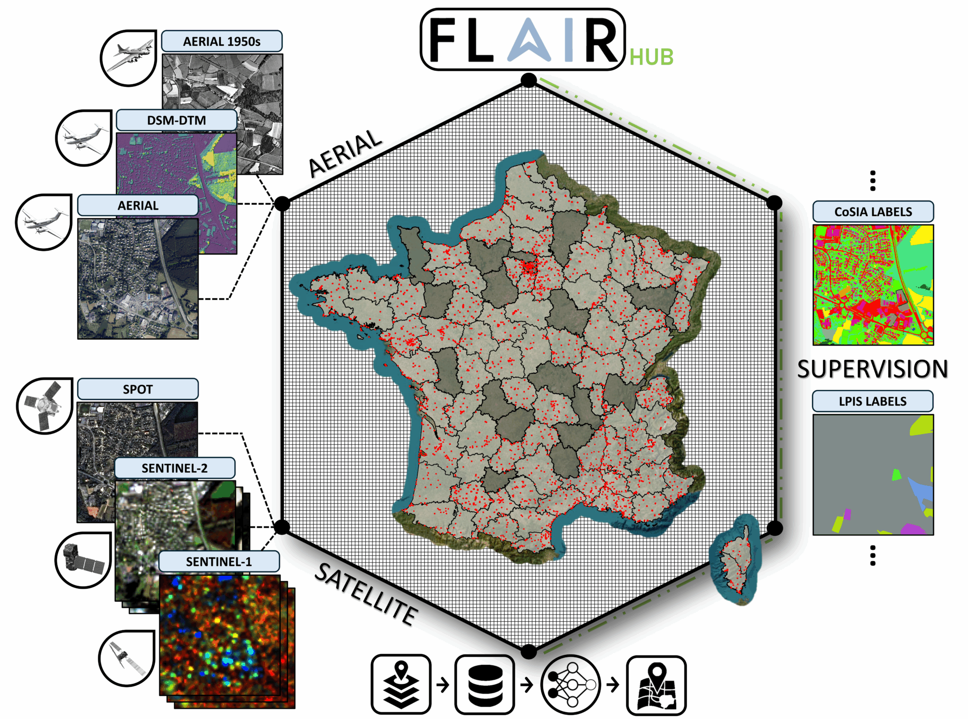 FLAIR-HUB covers more than 2,500 km2 of France's diverse eco-climates and landscapes, encompassing 19 land cover classes and 23 crop categories, and contains 63 billion manually annotated pixels, while integrating complementary data sources.