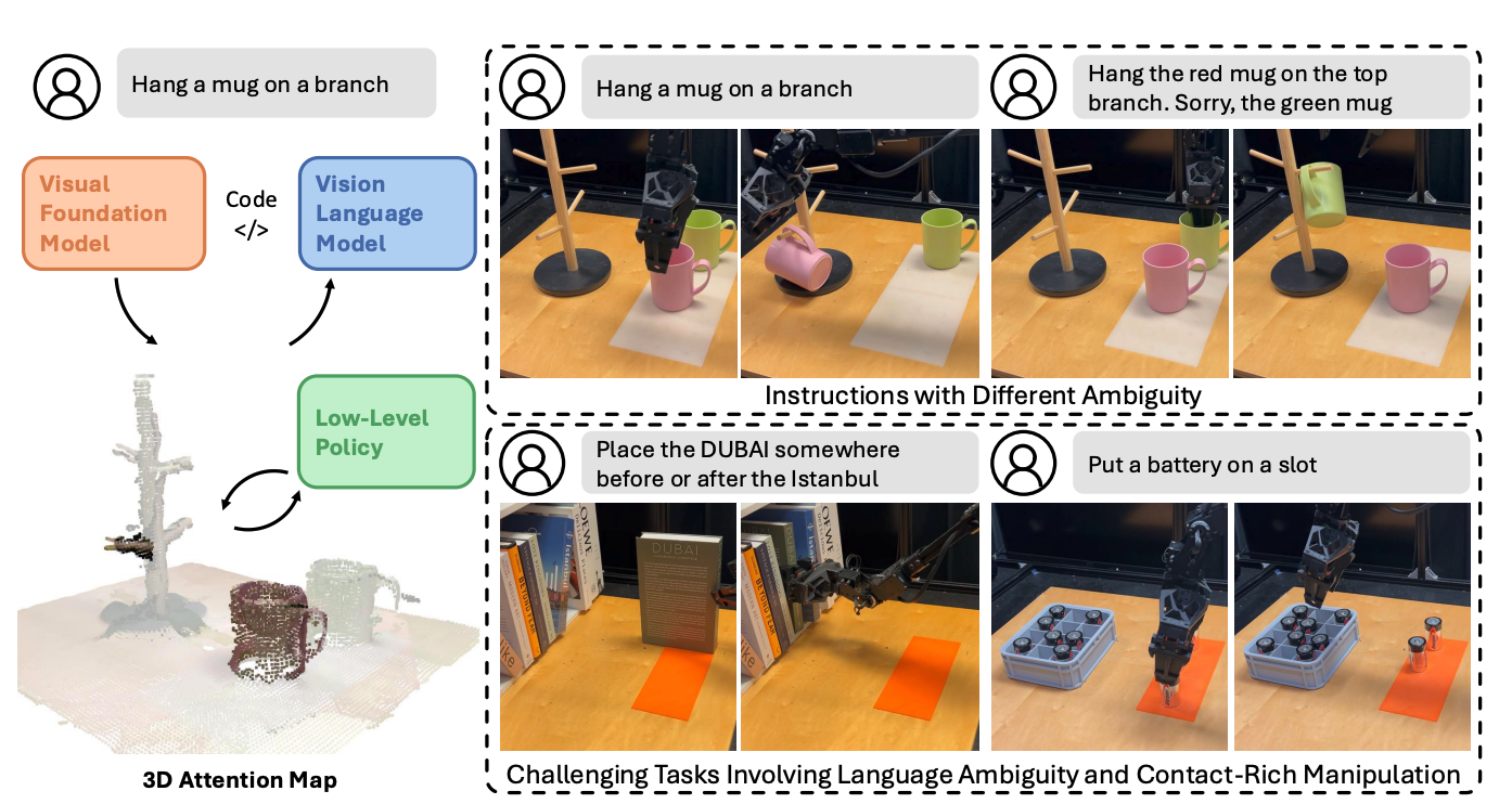 This paper introduces a robot task execution framework for language ambiguity and polysemy, CodeDiffuser. The framework parses natural language instructions by using the code generated by the visual language model, and calculates the three-dimensional attention map through the visual base model as an intermediate representation to solve the problem of abstract and ambiguous language instructions. Experimental results show that after the introduction of CodeDiffuser, the performance of the system has been significantly improved, and it has successfully completed complex tasks involving language ambiguity, intensive operations, and multi-object interactions.