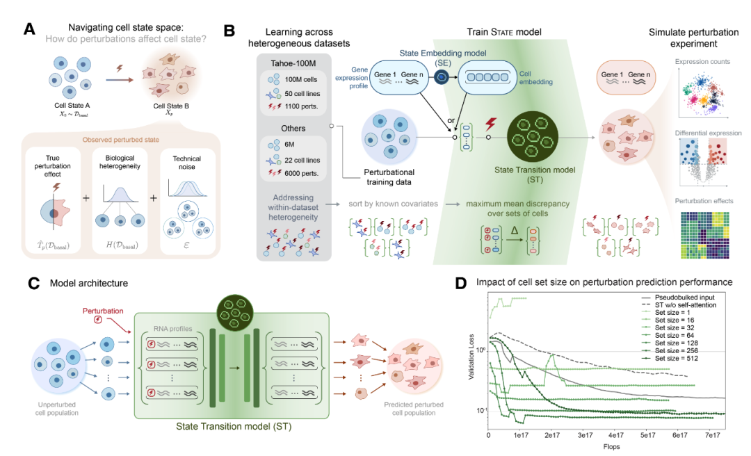 This paper introduces a machine learning architecture called State, which is used to predict the response of cells to different types of interference (such as genetic, chemical or signaling intervention). By combining the state transition model and the cell embedding model, the State model can effectively process and simulate more than 100 million disturbed cell data across 70 different cell environments. Compared with existing models, State performs significantly better than 50% on multiple large data sets, especially in identifying differential gene expression, with an accuracy of more than twice.