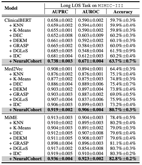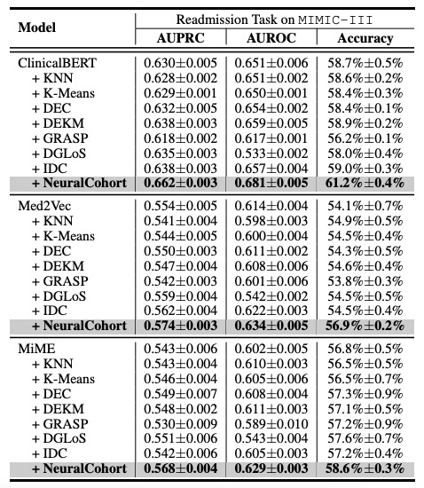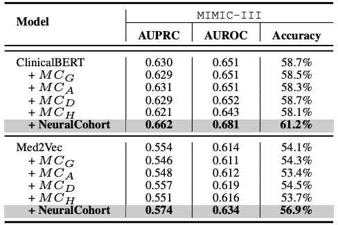 The overall experimental results are shown in the following table. NeuralCohort performs well in two prediction tasks of the MIMIC-III dataset. Compared with the traditional baseline model,The AUPRC indicator was improved by up to 8.0%, the AUROC indicator was improved by 8.1%, and the accuracy was significantly higher by 16.3%.