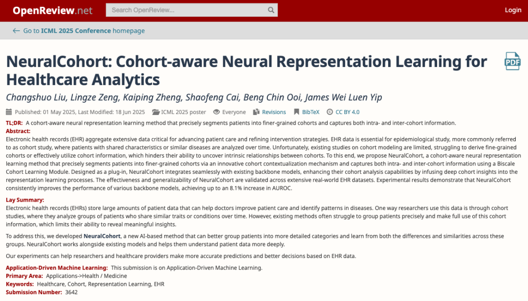 The related research results were selected for ICML 2025 under the title "NeuralCohort: Cohort-aware Neural Representation Learning for Healthcare Analytics".