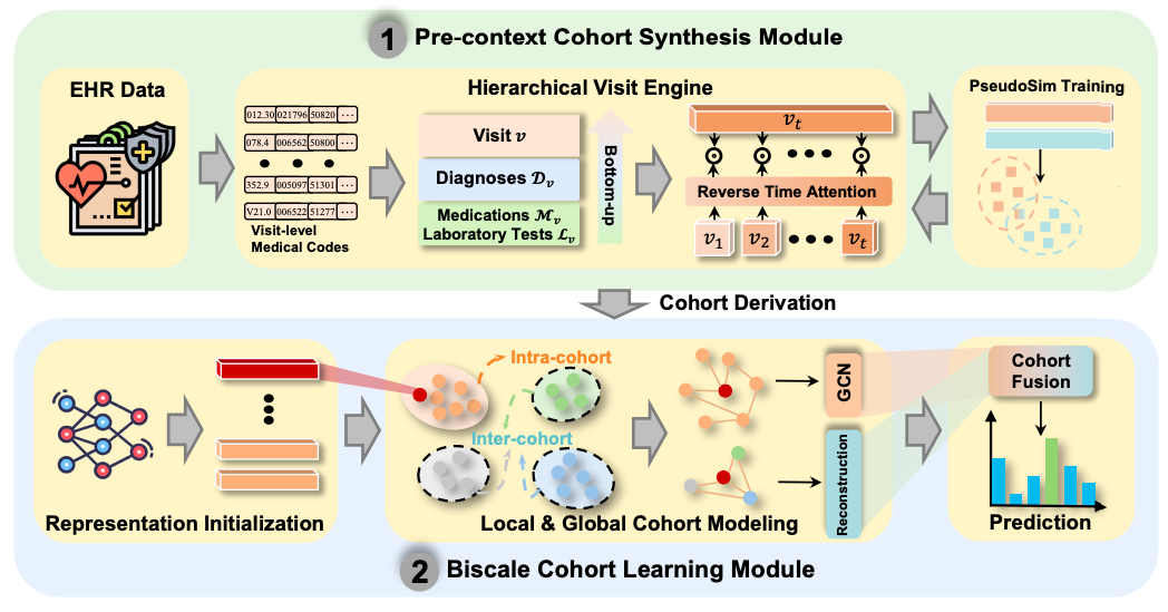 In order to effectively integrate patient cohorts to enhance the representation learning effect of electronic health record (EHR) data, NeuralCohort consists of two core modules: Pre-context Cohort Synthesis Module and Biscale Cohort Learning Module.