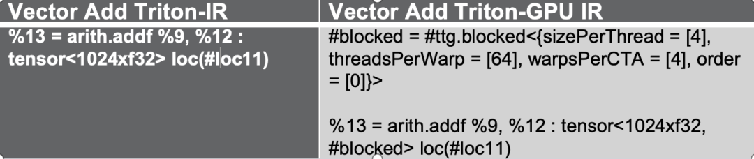 These optimization processes first convert Triton-IR to Triton-GPU IR. In this process, layout information is embedded into the IR. Take the following figure as an example, where the tensor is represented in the form of #blocked layout.