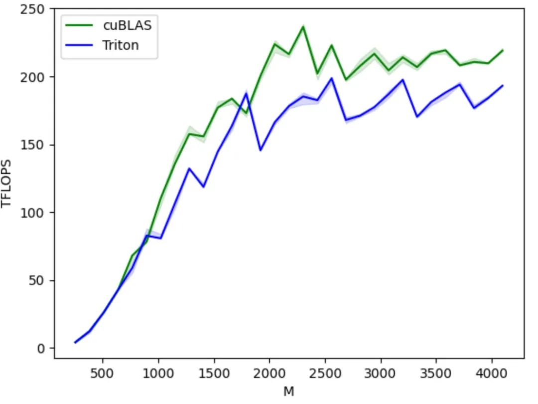 Compared to CUDA, Triton hides the thread-level operation control and instead lets the compiler automatically take over details such as shared storage, thread parallelism, merged memory access, and tensor layout, reducing the difficulty of the parallel programming model while improving the efficiency of GPU code development, achieving an effective balance between development efficiency and program performance. Developers can focus on the design and implementation of the algorithm without having to worry too much about the underlying hardware details and programming optimization techniques. As long as they understand simple parallel programming principles, they can quickly develop GPU code with better performance.