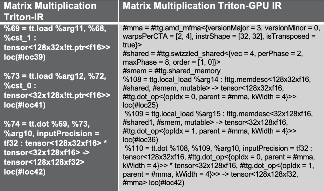 If we try another Triton matrix multiplication example, the above optimization flow introduces shared memory access to improve performance, which is a common optimization solution for matrix multiplication, while using the amd_mfma layout designed for the AMD MFMA accelerator.