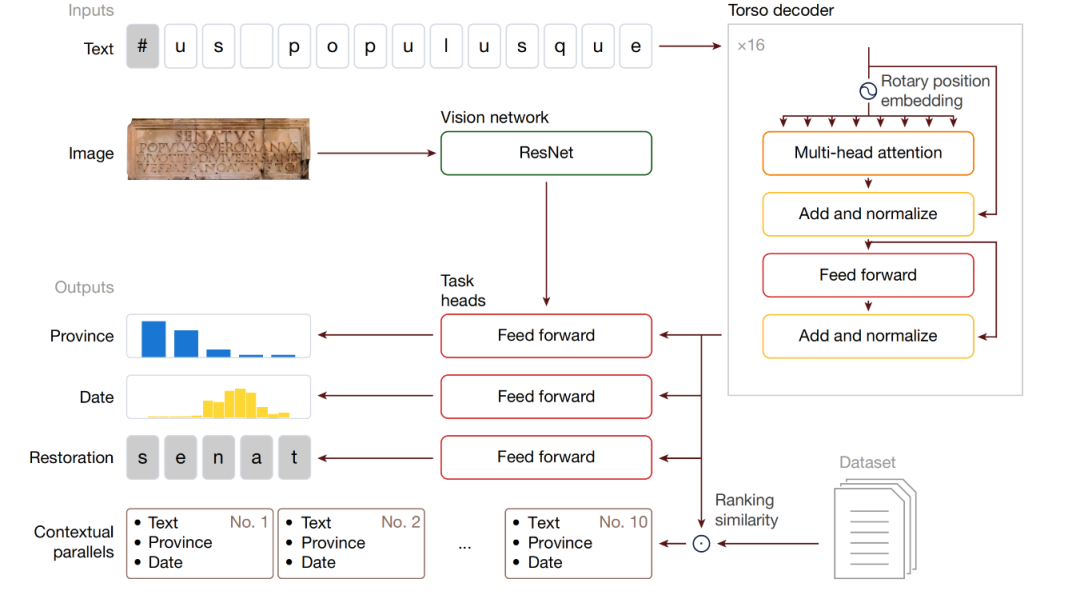 Aeneas is a multimodal generative neural network.A Transformer-based decoder is used to process the text and image input of the inscription, and a shallow visual neural network is used to retrieve similar inscriptions from the Latin inscription dataset and sort them by relevance. The input text is processed by the core part of the model, the "torso".