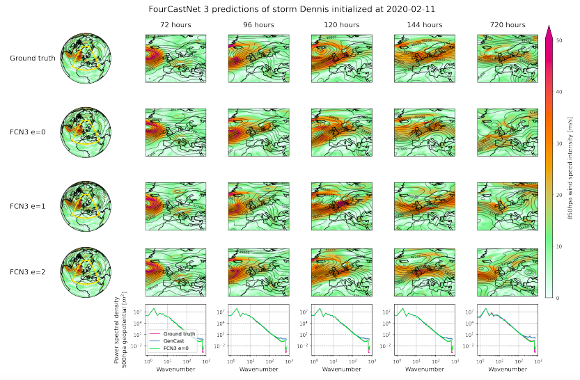 Considering that CRPS and RMSE can only be evaluated point by point and cannot measure spatiotemporal correlations, the research team supplemented the physical fidelity of the model through case studies. As shown in the figure below, taking the extratropical storm Dennis, which was reported at 00 UTC on February 11, 2020, as an example, the results of the 850 hPa wind speed and 500 hPa geopotential height forecast 48 hours before its landfall in Ireland and the British Isles show thatFCN3 can reproduce this weather event, and the covariance relationship between wind speed and pressure field is reasonable.The angular power spectral density (PSD) of the 500 hPa geopotential height maintains the correct slope; even when the forecast period is extended to 30 days, the angular power spectrum does not decay, and the forecast always maintains a sharp resolution.