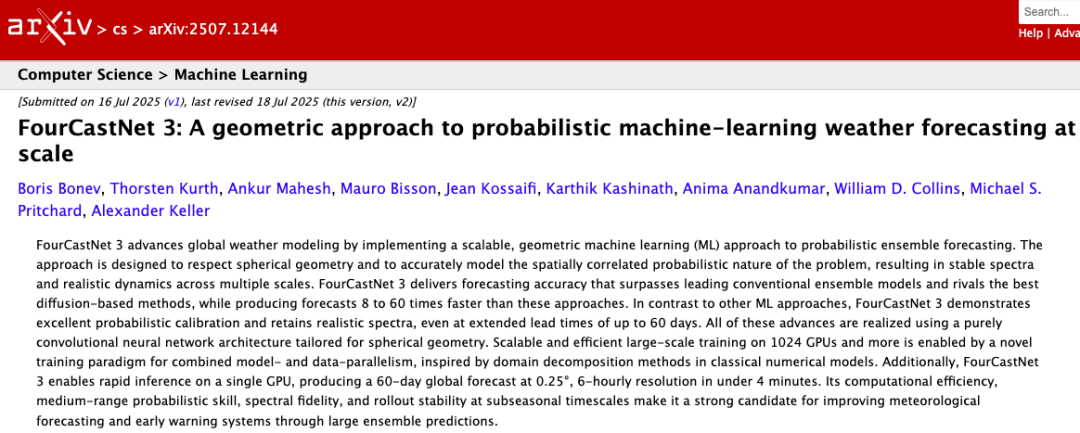 The related research results were published on arXiv under the title "FourCastNet 3: A geometric approach to probabilistic machine-learning weather forecasting at scale."