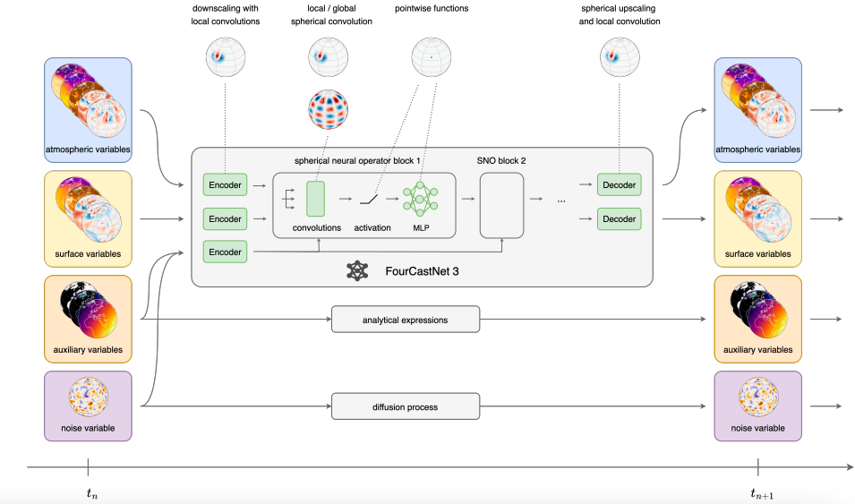 FourCastNet 3 (FCN3) is a probabilistic model consisting of an encoder, a decoder, and 8 neural operator blocks.Based on the hidden Markov model framework, given the 0.25° grid atmospheric state uₙ at a certain time tₙ, the model can predict the state uₙ₊₁=F_θ(uₙ, tₙ, zₙ) 6 hours later, where randomness is introduced through the random noise vector (noise variables) zₙ - zₙ comes from multiple spherical diffusion processes with different space-time scales, thereby capturing the uncertainty of atmospheric evolution.