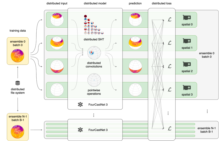 It is this carefully selected, divided, and processed dataset that provides a solid foundation for FCN3 to learn the probabilistic evolution of the global atmosphere end-to-end on 1,000+ GPUs, ensuring effective model training and accurate forecasting.