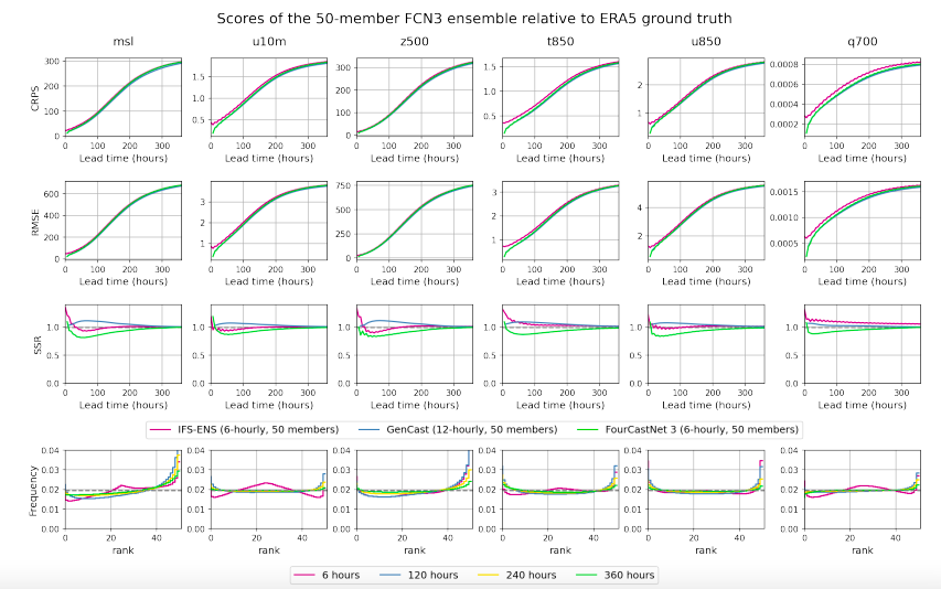 In terms of computational efficiency, thanks to the design of directly generating set members in one step,FCN3 can complete a 15-day, 6-hour interval, 0.25° spatial resolution forecast in just about 60 seconds on a single NVIDIA H100 GPU.In comparison, GenCast takes 8 minutes to complete the same-length forecast (with a temporal resolution of only half that of FCN3) on a Cloud TPU v5 instance, while IFS takes about 1 hour to run at a 9 km operational resolution on 96 AMD Epyc Rome CPUs. If we ignore the differences in hardware and resolution,FCN3 is about 8 times faster than GenCast and about 60 times faster than IFS-ENS.