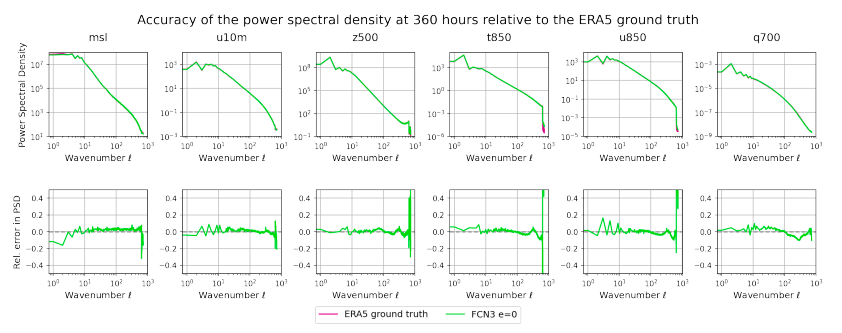 Analysis of the power spectral density for the entire year of 2020 and its relative error to the true ERA5 value shows that the error in high-wavenumber regions is always bounded (between -0.2 and 0.2), thanks to the geometric and signal processing principles followed by the model architecture, as well as the CRPS loss that takes into account both local and global distributions.Encourage the model to learn the correct spatial correlation.