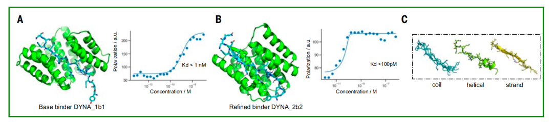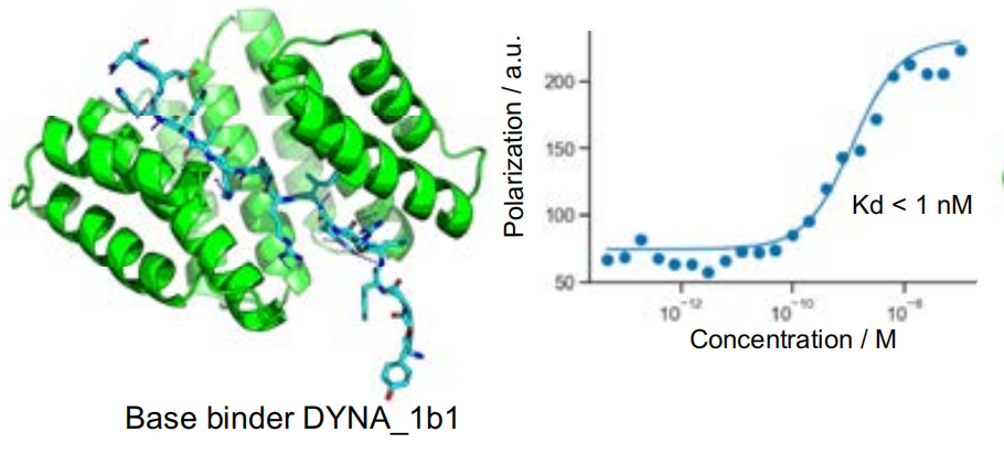 The best match was also optimized to enhance the fit between the designed binding protein and the target peptide.The study selected the dissociation constant of DYNA_1b1 binding protein and dynorphin for testing, and optimized the radiofrequency diffusion for the highest hit rate of synthetic targets.The results showed that among the 48 designs, 45 showed strong affinity in the screening test, and only the dissociation constants of 6 designs showed weak affinity.