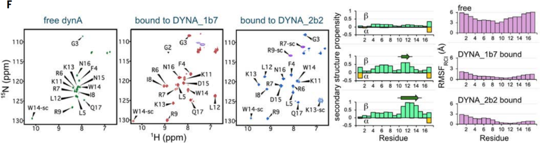 To verify the changes in the dynorphin structure during binding, the nuclear magnetic resonance (NMR) spectra of isotope-labeled dynorphin A were detected in solution when it was unbound, bound to DYNA_1b1, and bound to DYNA_2b2 with higher affinity.
