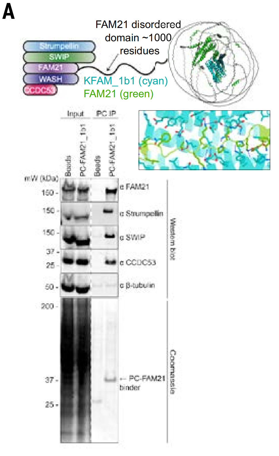 The study used immunoprecipitation models of the WASH complex and the PER complex. The WASH complex includes WASH, FAM21, CCDC53, SWIP, and WASHC2. Testing showed that FAM21_1b1 extracted the entire WASH complex from cell lysates.