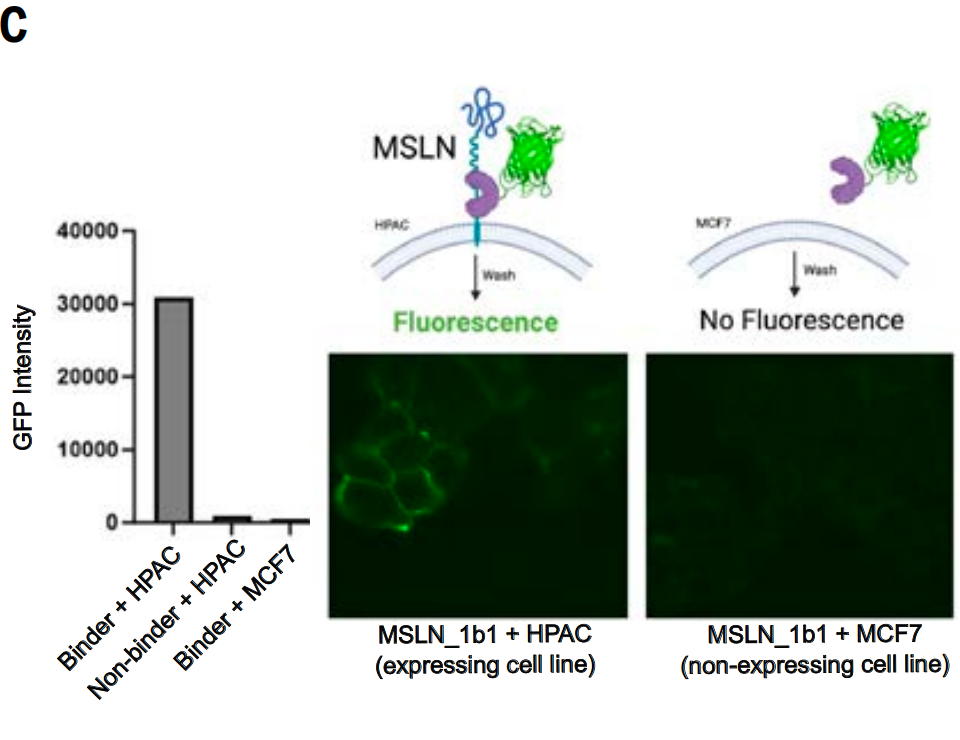 The researchers fused green fluorescent protein (GFP) to MSLN_1b1 and incubated it with cells expressing MSLN (human pancreatic adenocarcinoma cell line HPAC) and a cell line that does not express MSLN (Michigan Cancer Foundation breast cancer cell line MCF7), while also including a GFP-fusion protein that does not bind to MSLN as a control.
