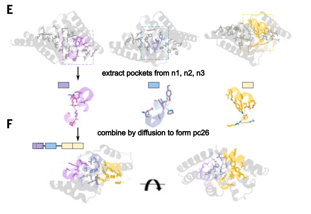 During the pocket assembly step,The researchers used the RFdiffusion model to create interfaces between pockets, resulting in an overall rigid structure and generating a template for assembling the binding pockets into a new backbone.The various pockets in the template are arranged according to different orders and geometries to interact with the peptide target in a series of extended conformations, allowing for more general recognition of non-repetitive sequences.