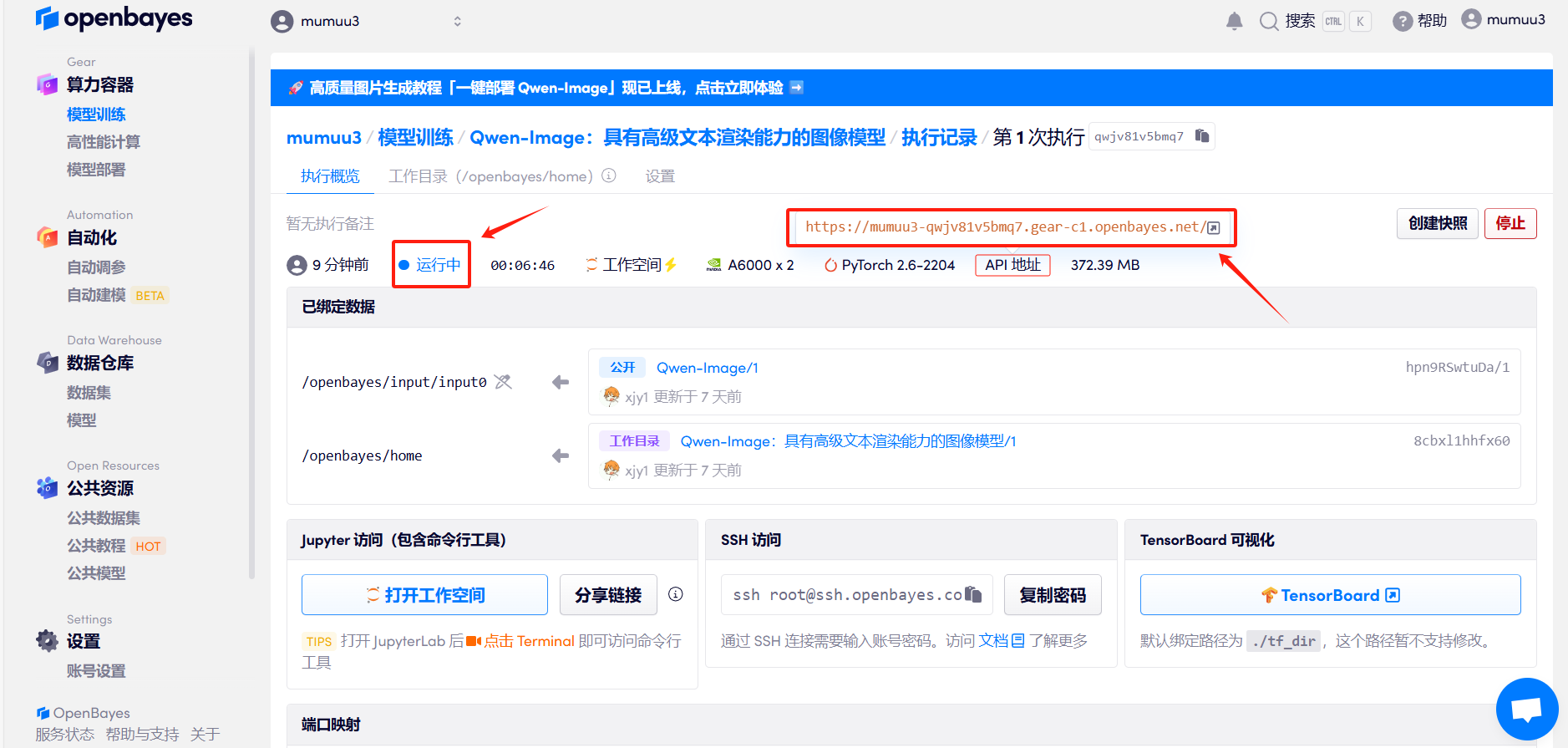 4. Wait for resources to be allocated. The first cloning process will take approximately 3 minutes. When the status changes to "Running," click the arrow next to "API Address" to jump to the Demo page. Please note that users must complete real-name authentication before using the API address.