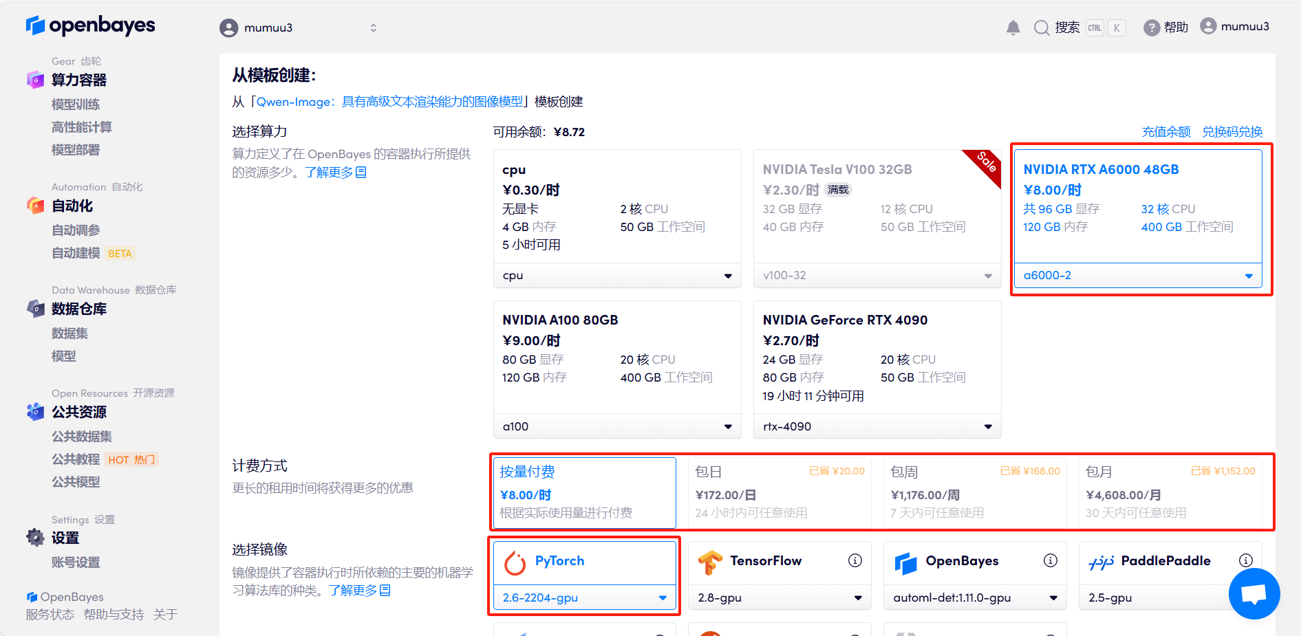 3. Select the NVIDIA RTX A6000 48GB and PyTorch images, choose Pay-As-You-Go or Daily/Weekly/Monthly plan based on your needs, and click Continue. New users can register using the invitation link below to receive 4 hours of free RTX 4090 and 5 hours of free CPU time!