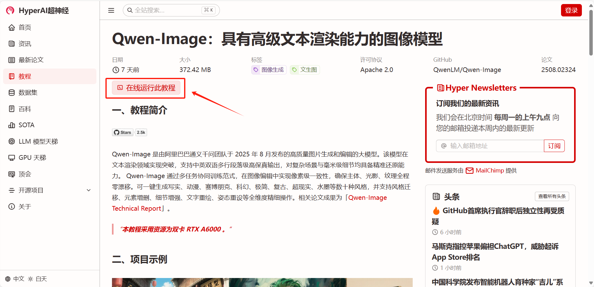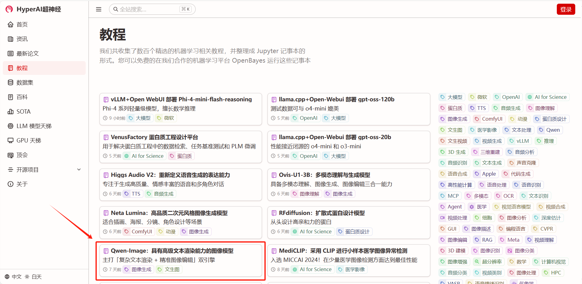 1. On the hyper.ai homepage, select the Tutorials page, choose Qwen-Image: An Image Model with Advanced Text Rendering, and click Run this tutorial online.