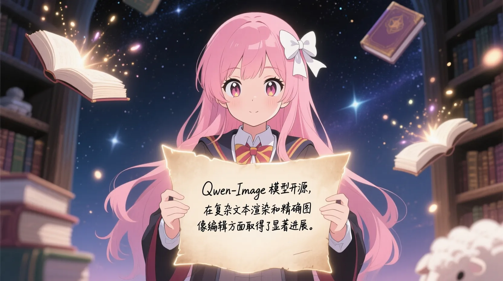 Prompt:A girl in anime style, with a delicate anime face, sparkling eyes, long pink hair, and a white bow. She holds a luminous parchment with the neatly handwritten message, "Qwen-Image model open source, significant progress in complex text rendering and precise image editing." She wears a magic academy uniform, and the background is a starry study with a floating magic book and particle lighting effects. The artwork is in the Ghibli style, with a soft light filter and a depth of field blur.