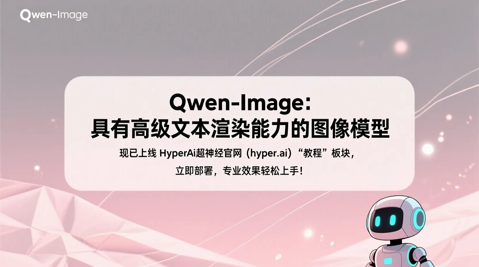 Prompt: This poster features a graphic design with a soft, gradient background in the Morandi color palette. The primary color palette is a grayish-pink base, layered with transitions of haze pink and oatmeal white. The core text is centered. "Qwen-Image: An Image Model with Advanced Text Rendering Capabilities" is now available in the "Tutorials" section of HyperAI's official website (hyper.ai). Deploy now for professional results! Decorative elements feature abstract geometric lines extending from the primary color palette. A cartoon-style anime robot juxtaposes the background, complementing the subtle light particles and wrinkled paper texture. The text edges are sharp and free of jagged edges.