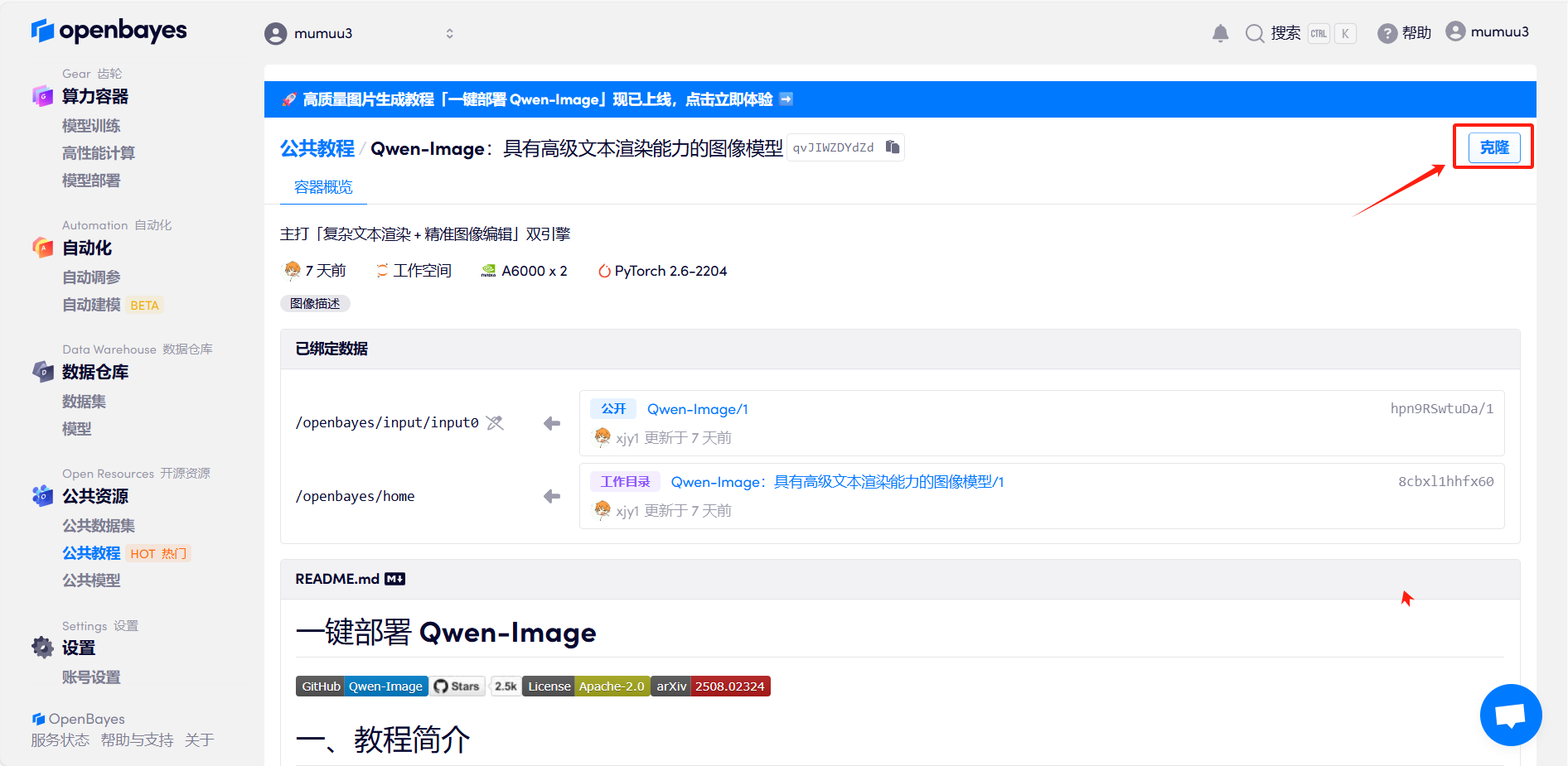 2. After the page jumps, click "Clone" in the upper right corner to clone the tutorial into your own container.