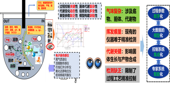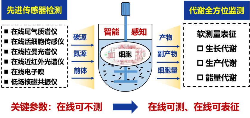 Intelligent perception is the foundation, as efficient fermentation is mostly fed-batch fermentation, requiring a comprehensive understanding of process characteristics for precise feeding.An intelligent sensing system for biomanufacturing processes has been developed, which enables all-round monitoring of metabolism through advanced sensor detection.Intelligent sensing has evolved from initially detecting basic parameters such as bacterial flora, temperature, and agitation to utilizing exhaust gas mass spectrometers (measuring exhaust oxygen, carbon dioxide, and related rates—critical parameters of aerobic fermentation). In recent years, online live cell sensors, online Raman spectrometers, and near-infrared spectrometers have been introduced. Currently, online near-infrared and mid-infrared technologies are being promoted for contactless detection, acquiring relevant data through the fermenter window. Electronic noses can detect metabolic signatures of fermentation exhaust, and low-field nuclear magnetic resonance can detect substrates and products. These technologies have made previously unmeasurable fermentation processes measurable, increasing detection efficiency from hours to seconds, far exceeding the frequency of traditional offline detection.