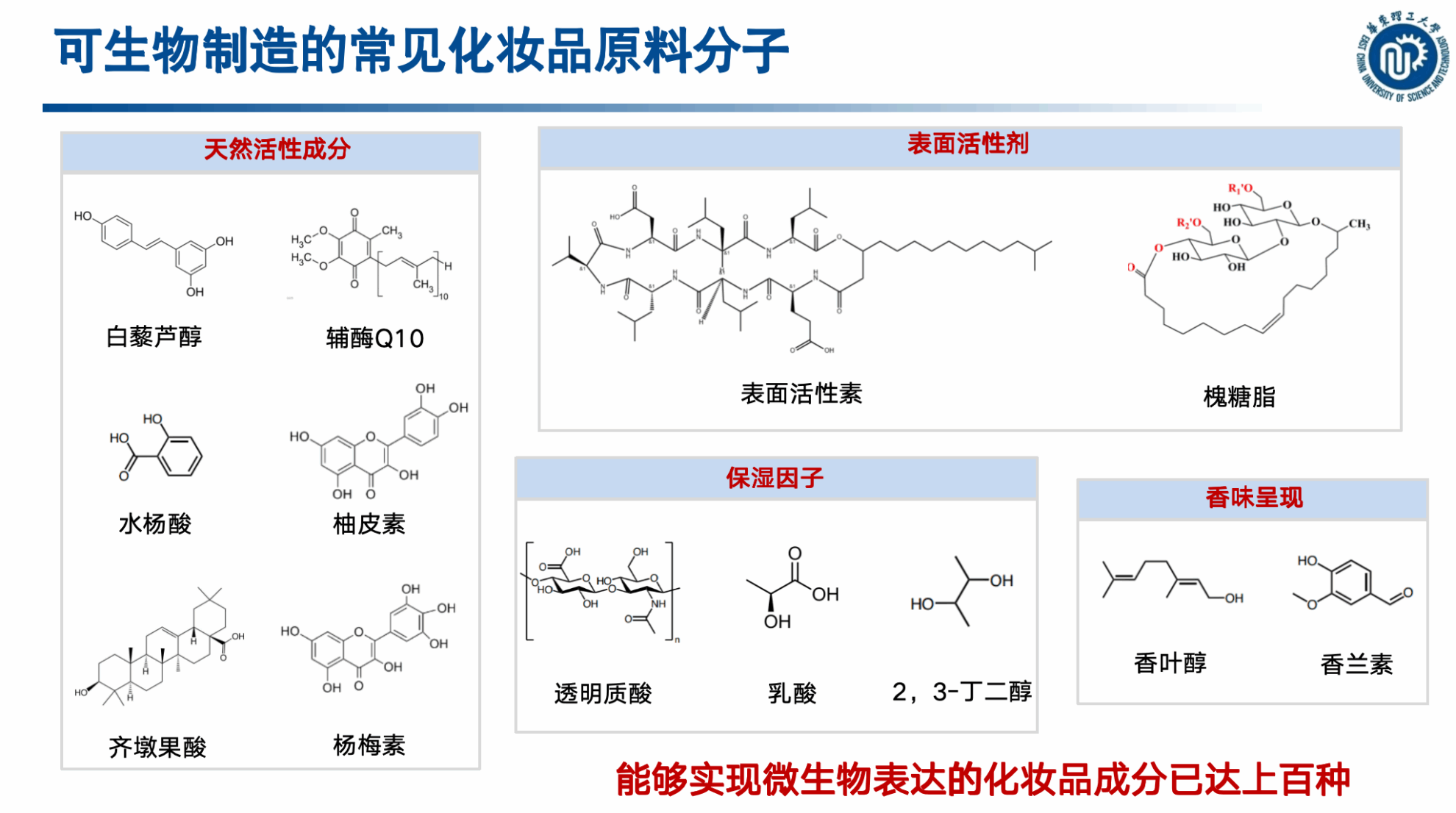 The application of synthetic biology and biomanufacturing in the cosmetics field is relatively mature and has a wide range of applications. This is because cosmetics require small amounts, and even if the cost is high, there is still a market. For example, after large-scale cultivation of Tianshan Snow Lotus, only a small amount can cause the price of related products to rise significantly. In addition, many cosmetic products are derived from natural active ingredients, such as resveratrol, naringenin, coenzyme Q10, etc.Although there are currently hundreds of cosmetics that can be expressed by microorganisms, only a handful of them are truly fully biomanufactured.
