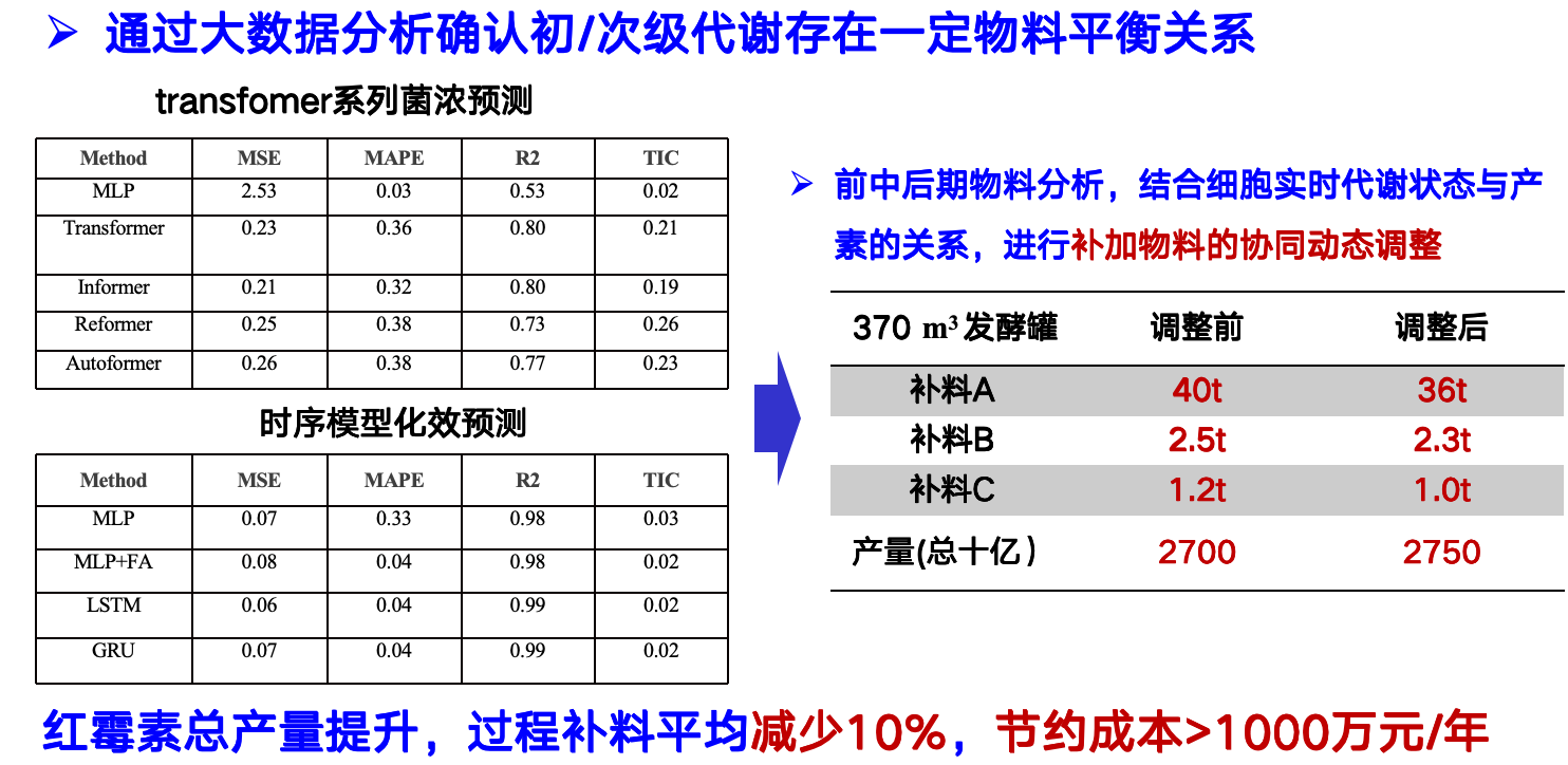The first is the production of erythromycin. Erythromycin is a macrolide antibiotic, and its derivatives such as clarithromycin and azithromycin are widely used.During the fermentation process, we use a variety of sensors to conduct all-round, real-time, online, and multi-dimensional detection of macroscopic physiological metabolic characteristics and features with extremely high efficiency.The measurement time for sugar, alcohol, and oil concentrations has been reduced from 12 hours using traditional methods to just 2 minutes. By modeling over 100 batches of full-parameter data from a 370-ton erythromycin fermenter, we ultimately found that the erythromycin fermentation unit is most strongly correlated with bacterial concentration, viscosity, and chemical potency during the fermentation process. Based on this highly correlated model of bacterial concentration and chemical potency, sugar, nitrogen, and oil feeds for the 370-ton fermenter are now computer-determined based on this model. This allows for more precise feed amounts, resulting in increases in fermentation units and overall yield. The reduction in feed alone saves 10 million yuan annually and increases the company's annual profit by at least 60 million yuan.