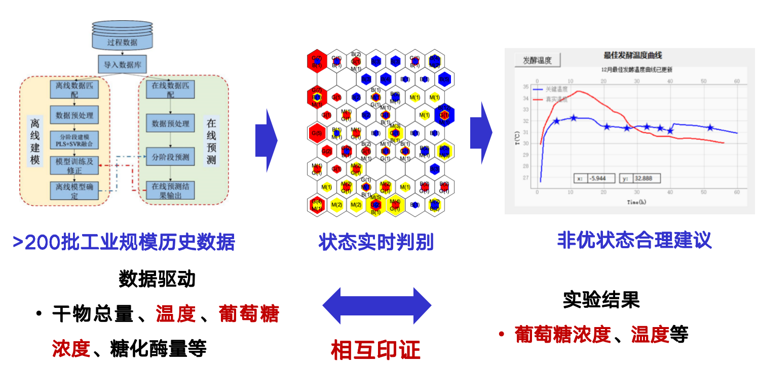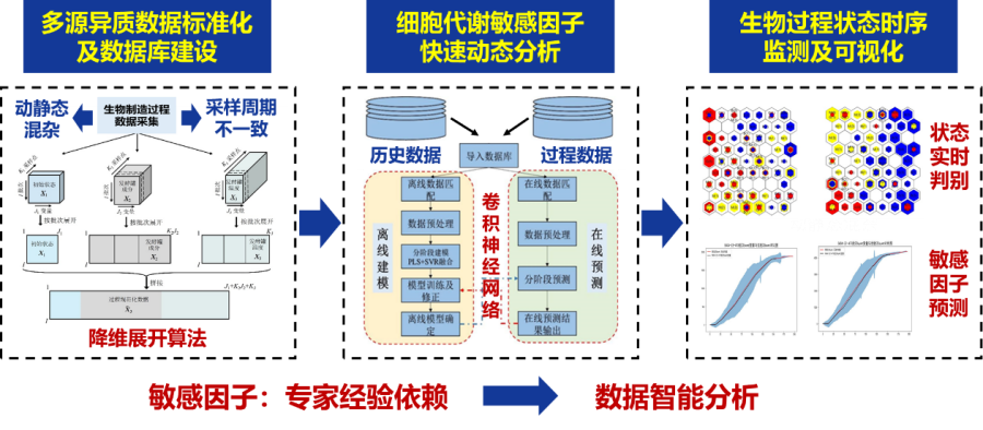 Intelligent analysis process,First, through the standardization of multi-source heterogeneous data and database construction, the cell metabolism sensitive factors are rapidly and dynamically analyzed, and finally the time-series monitoring and visualization of the biological process status are realized.Sensitive factors have evolved from initially relying on expert experience to intelligent data analysis. Therefore, data science has become crucial in connecting perception and control. Research requires identifying key control points through modeling from massive amounts of data. For example, in the case of fuel ethanol fermentation, over 100 batches of historical and process data were processed and filtered using a dimensionality reduction and expansion algorithm, retaining approximately 60-70 batches of valid data. This allows the determination of good, medium, and poor fermentation conditions and corresponding regions, guiding process optimization.