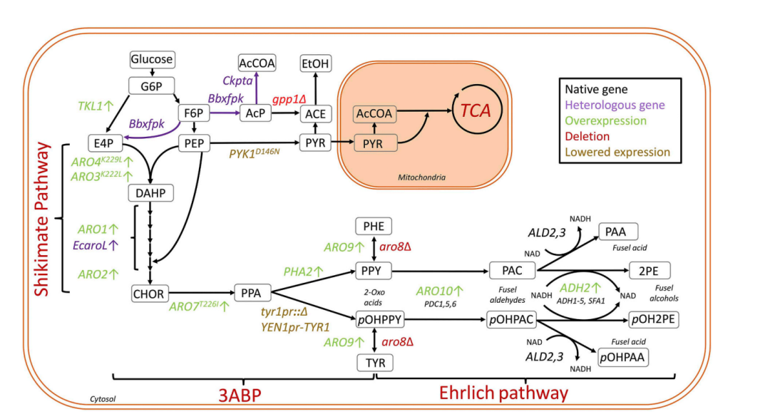 * Paper address:Hassing, EJ, de Groot, PA, Marquenie, VR, Pronk, JT, & Daran, JMG (2019). Connecting central carbon and aromatic amino acid metabolisms to improve de novo 2-phenylethanol production in Saccharomyces cerevisiae. Metabolic Engineering, 56, 165-180.
