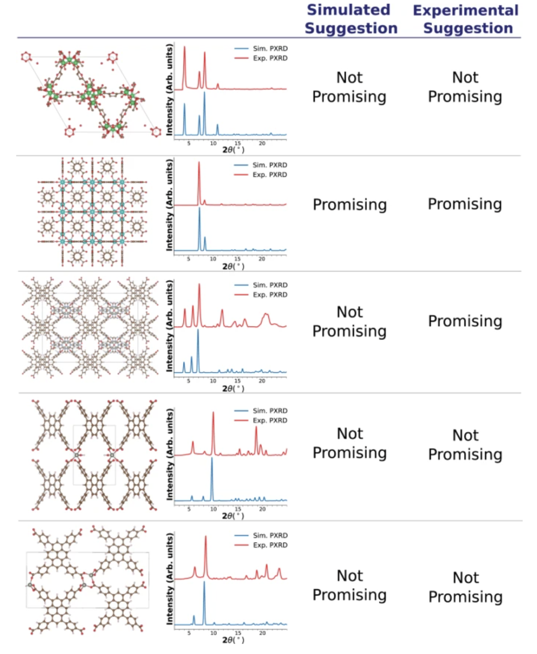 The figure below shows the model recommendation results, comparing the differences between the simulated PXRD patterns and the experimental PXRD patterns: