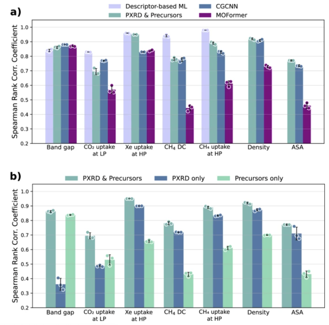 To prove that the model can effectively predict various MOFs properties and lay the foundation for the combination of MOFs synthesis and application, the research team evaluated the accuracy of the model, using the Spearman rank correlation coefficient (SRCC) and mean absolute error (MAE) to evaluate the model's prediction accuracy in geometrically dependent properties, chemically dependent properties, and quantum chemical properties, and conducted benchmark comparisons with CGCNN, MOFormer, and descriptor-based machine learning models.