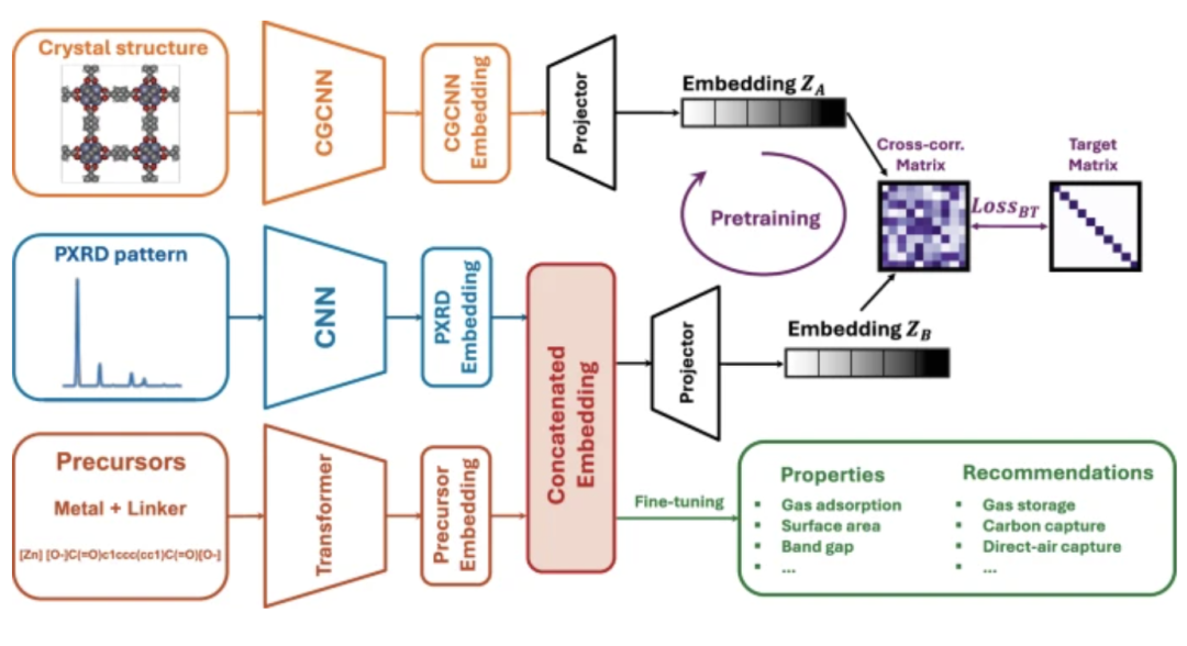 The workflow of this self-supervised multimodal model is shown in the figure below. A precursor string and a powder X-ray diffraction (PXRD) spectrum are used as inputs, embedded through a Transformer and a convolutional neural network (CNN), respectively, and passed to a regression head for fine-tuning. The precursor provides information about the material's chemical properties, while the PXRD pattern provides additional information about the overall geometric structure.