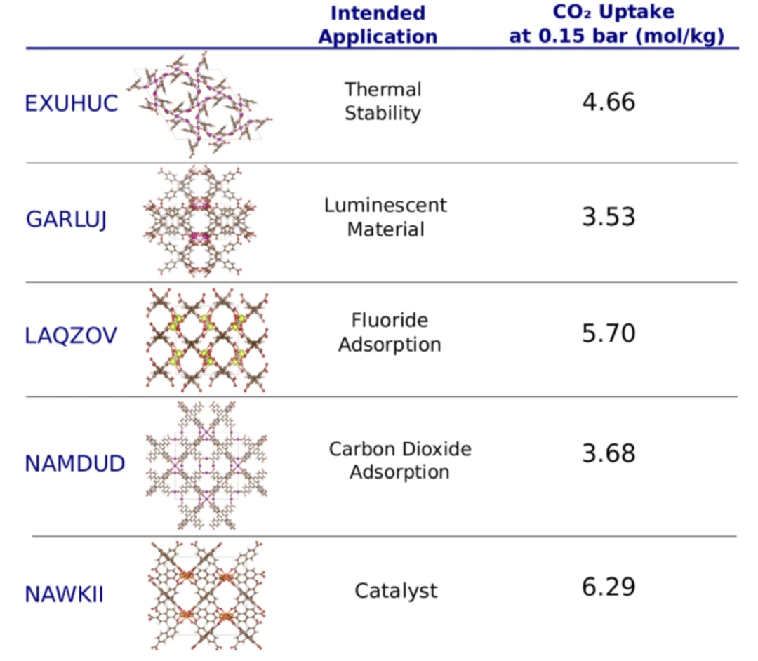 To verify the model's ability to predict future material applications, the researchers conducted a time-travel experiment.The model was trained using CoRE-2019 entries stored in the CSD database before 2017, and tested using entries stored after 2017 to simulate predictions for future materials. The goal of the experiment was to predict the performance of these MOFs in a specific application: carbon dioxide adsorption. The results showed that the model successfully identified 18 MOFs with potential for carbon capture, 15 of which were originally designed for other applications.