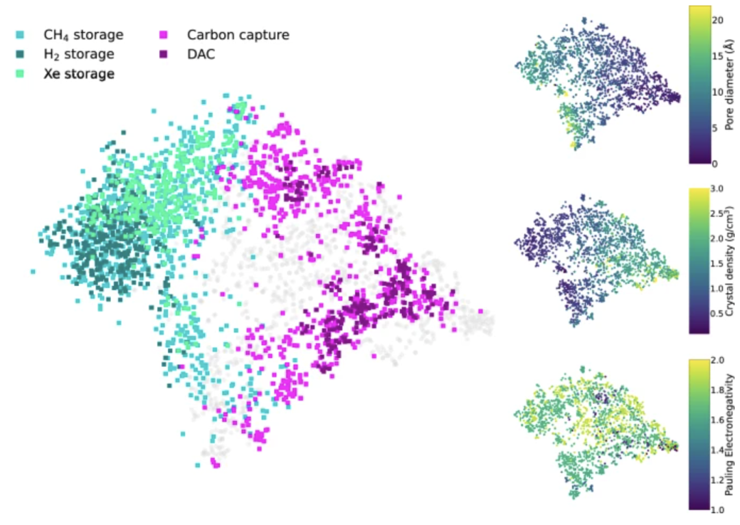 Based on the model's impressive performance, researchers developed a visual potential application recommendation system that matches newly synthesized MOFs with potential applications (such as gas storage and carbon capture) based on predicted material properties. Using t-SNE technology, the system projects the modal model's latent space and uses color to represent the recommended applications for MOFs. The following figure illustrates the mapping of synthesis information to application scenarios: