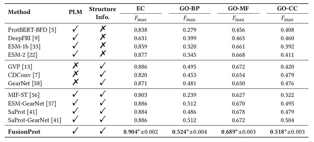 Finally, in a biological case analysis, FusionProt successfully predicted the EC number of the RNA polymerase ω subunit protein, which is difficult to handle with traditional methods. This result completely failed in models such as ESM-2, further proving that the learned representation can capture complex "structure-function" relationships and show broad application potential in drug development and protein function analysis.