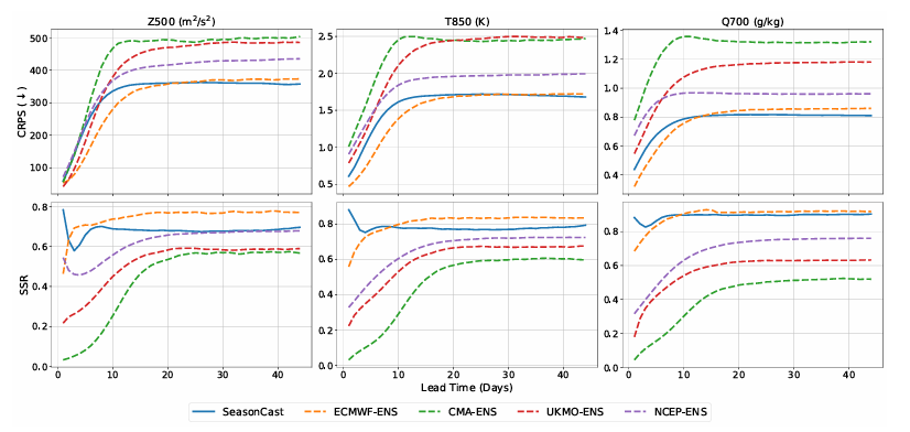 Regarding probabilistic indicators (Continuous Ranking Probability Score (CRPS) and Discrete Skill Ratio (SSR), with the latter being better the closer to 1), similar to accuracy indicators, within a shorter forecast lead time,OmniCast performs slightly worse than ECMWF-ENS, but it will surpass it after 15 days.In summary, OmniCast and ECMWF-ENS are the two best-performing methods under various variables and different forecast lead times. (See the figure below.)