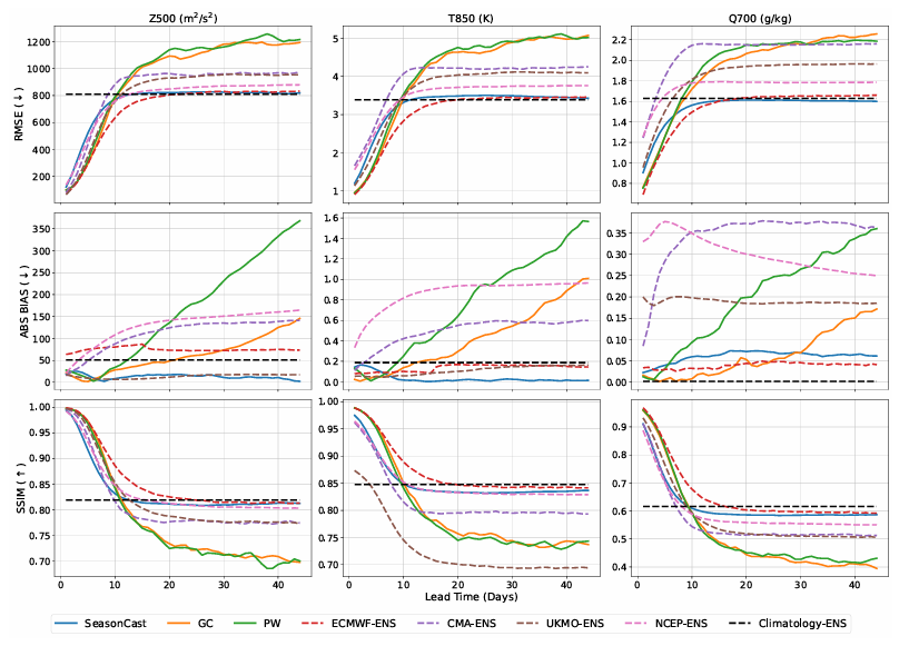 In terms of accuracy metrics (root mean square error (RMSE), absolute bias (ABS BIAS), and multi-scale structural similarity phase (SSIM)), OmniCast predictably underperforms other benchmark models in both RMSE and SSIM within the short-term forecast lead time. This is, of course, due to OmniCast's training objectives, but its relative performance will gradually improve as the forecast lead time increases.It achieves optimal performance comparable to ECMWF-ENS after 10 days.As shown in the following figure: