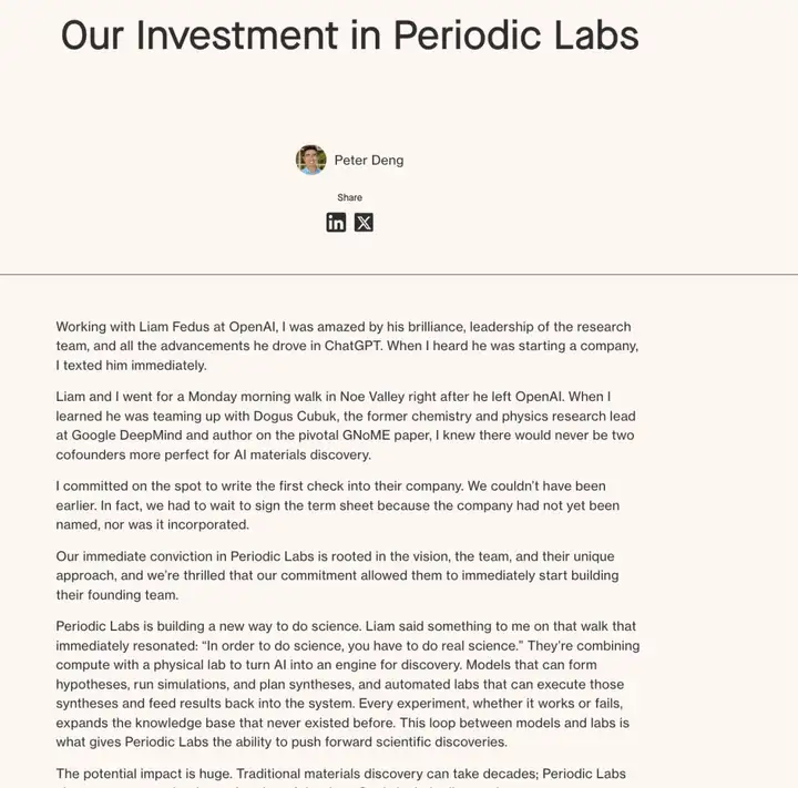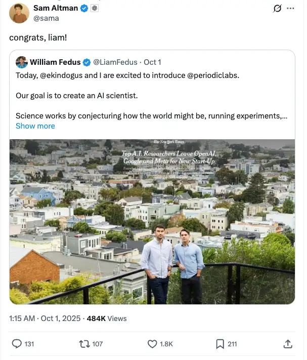 The absence of his former employer, OpenAI, is intriguing. Although Fedus received well wishes from management upon his departure and even hinted at potential support,Even Sam Altman sent his blessings when the company was founded.However, it ultimately did not appear on the list of investors. Some industry analysts speculate that this may stem from a fundamental difference in technological approaches: OpenAI focuses on general artificial intelligence, while Periodic Labs' "AI for Science" vertical approach is closer to the strategic direction of Google DeepMind.